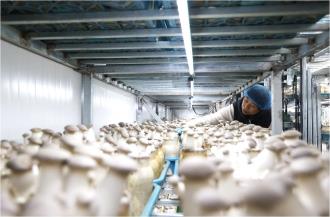 ▲大村鎮(zhèn)食用菌產(chǎn)業(yè)園樓宇工廠化基地里雪蓮菇豐收